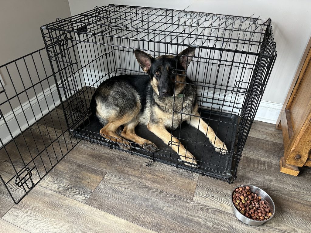 It took a good bit of encouragement — and some very persuasive treats — to convince her that the new, larger kennel with a soft dog bed was a much better fit.